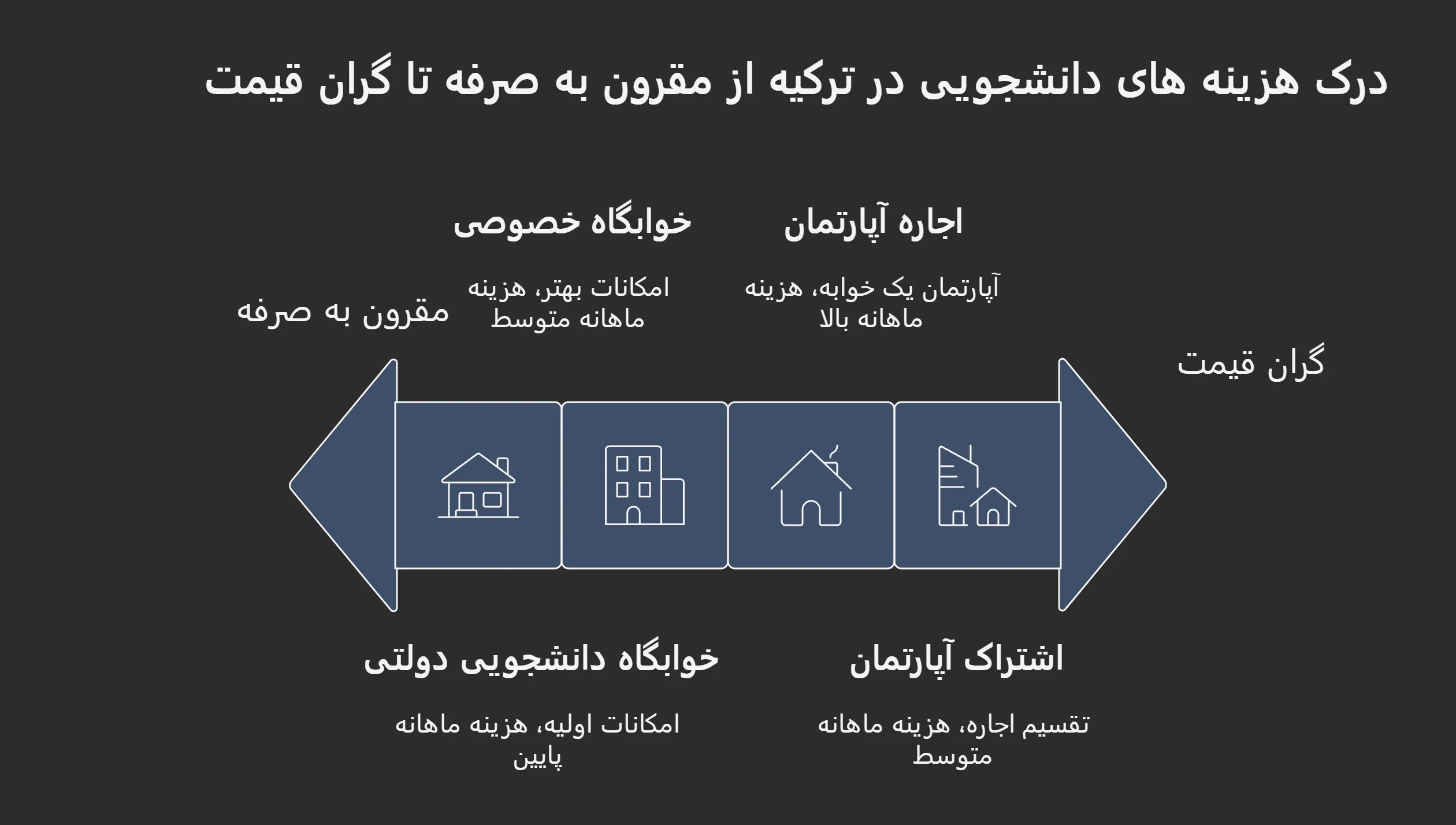• استفاده از خوابگاه‌های دولتی KYK: اگر بتوانید سهمیه خوابگاه دولتی بگیرید، هزینه ماهانه اقامت شما بین 1500 تا 3000 لیر (5 تا 11 میلیون تومان) خواهد بود که به شدت مخارج شما را کاهش می‌دهد. (در مقاله بعدی به صورت مفصل به خوابگاه‌ها پرداخته‌ایم).