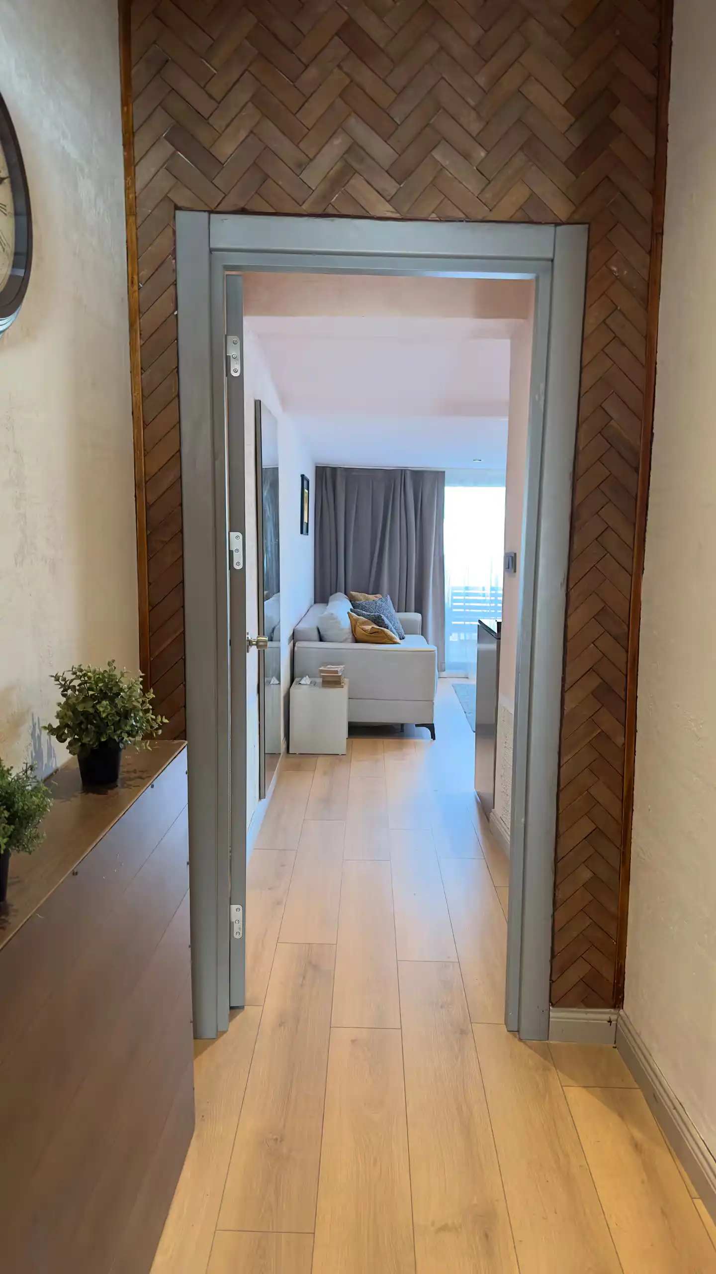 - ورودی زیبا و طراحی داخلی چشمنواز: از همان لحظه ورود به آپارتمان، با یک ورودی زیبا و طراحی داخلی شیک و مدرن مواجه میشوید که نویدبخش اقامتی لوکس است. ترکیب عناصر مدرن با ظرافت و دقت در جزئیات، فضایی گرم، دلنشین و بسیار راحت ایجاد کرده است.