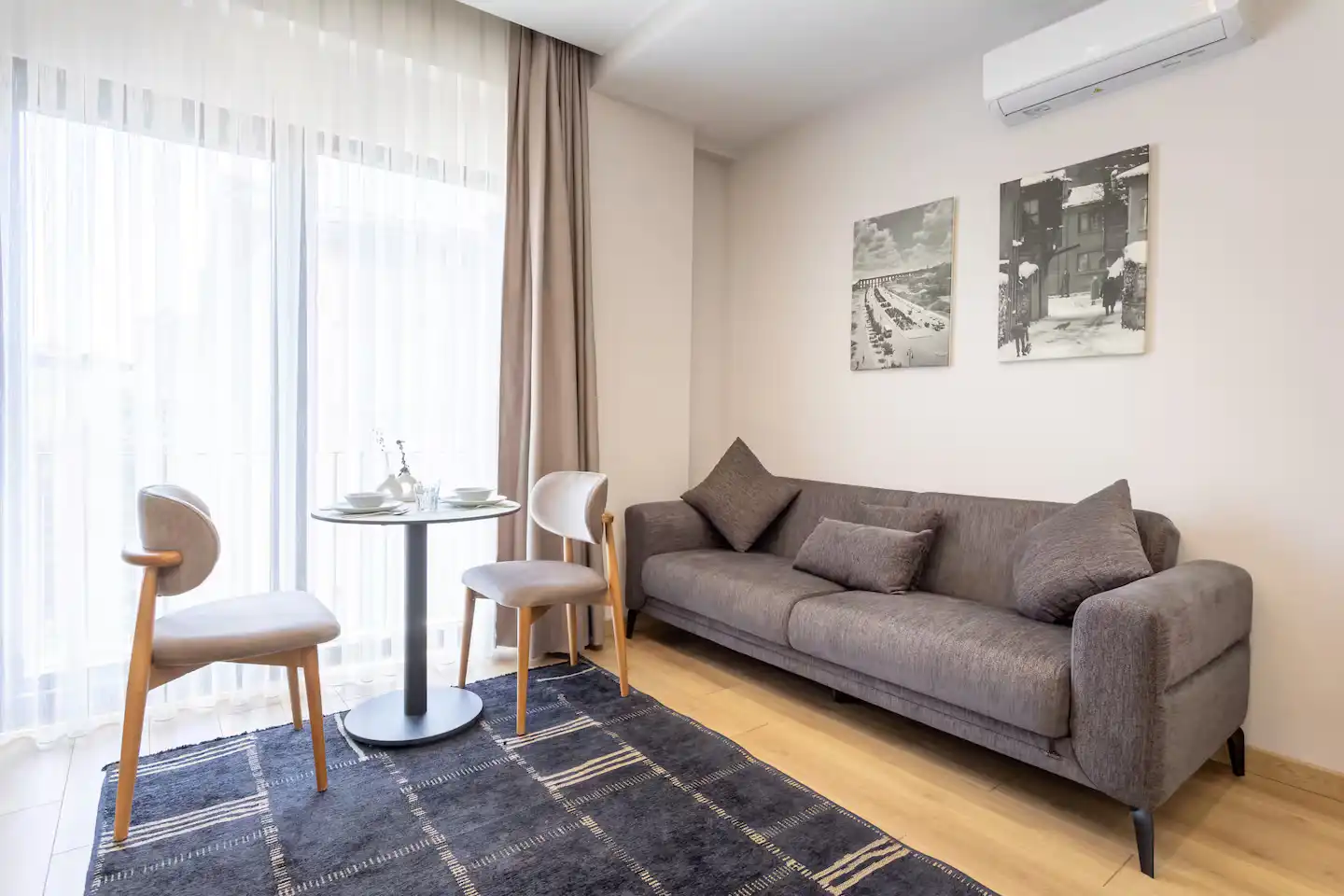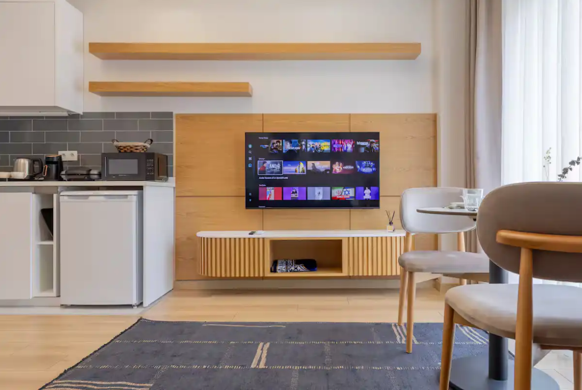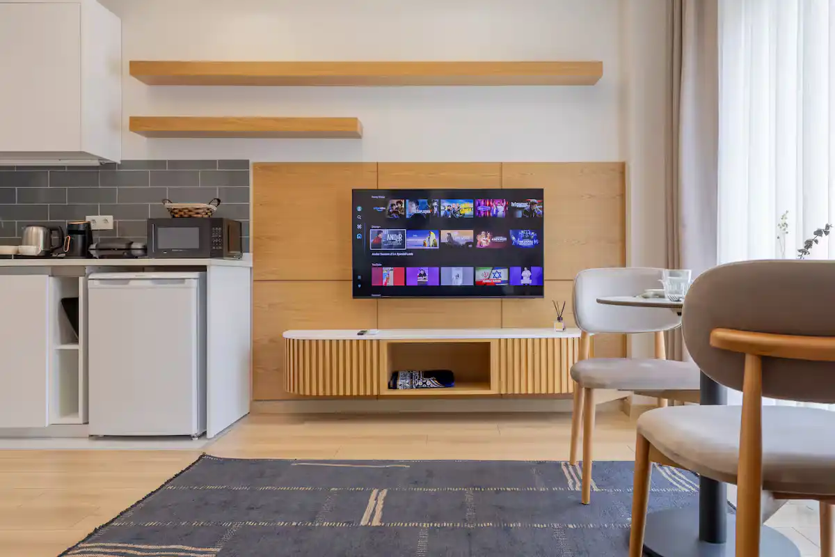 - اتاق نشیمن چندمنظوره: اتاق نشیمن دارای یک مبل تختخوابشو راحت برای ۱ یا ۲ نفر دیگر، یک تلویزیون هوشمند ۵۰ اینچ با دسترسی به نتفلیکس، پرایم ویدئو، دیزنی پلاس و کانالهای ماهوارهای (شامل عربی و اروپایی)، و یک فضای کار اختصاصی است.