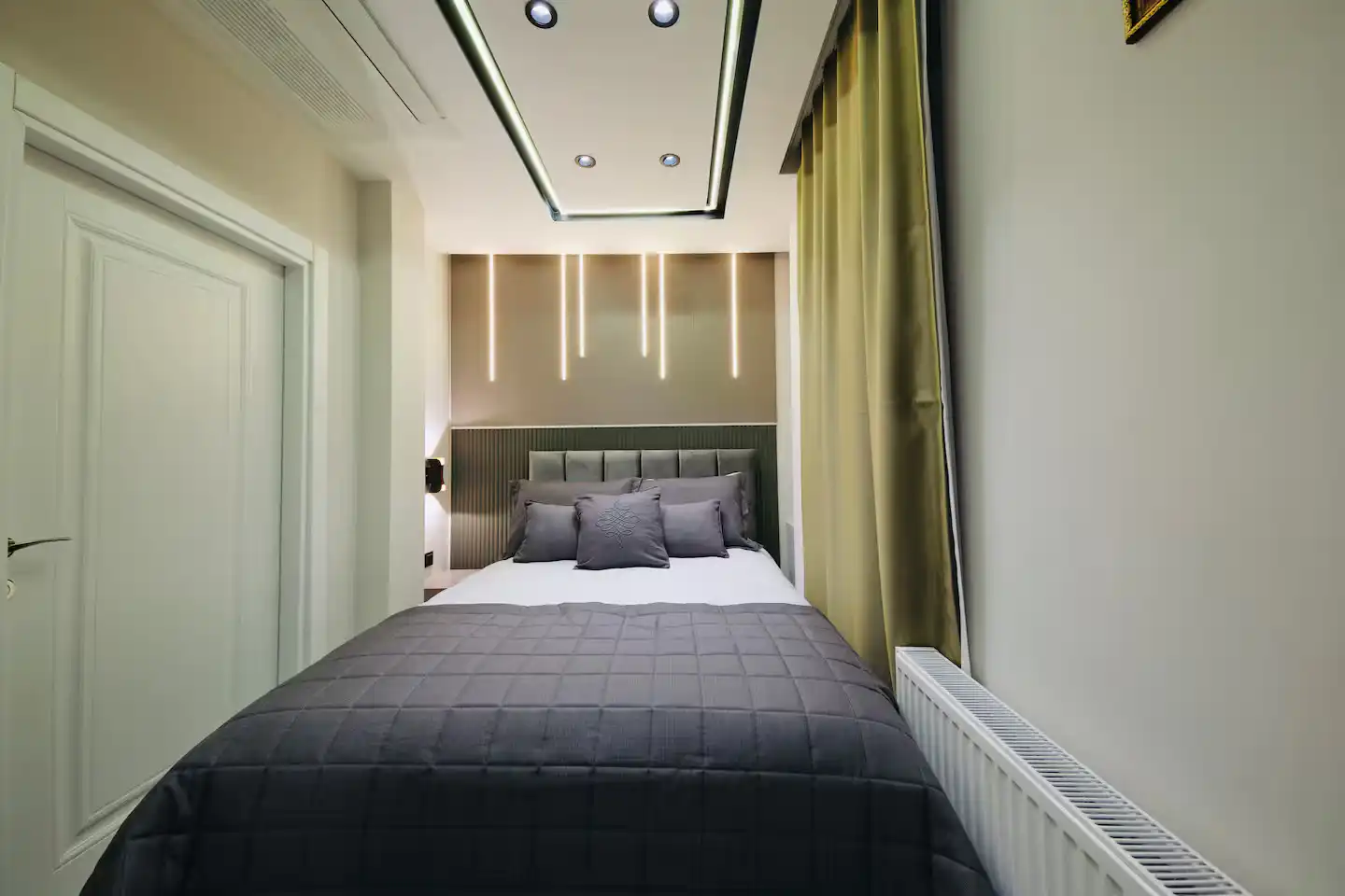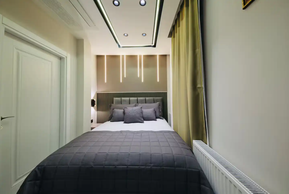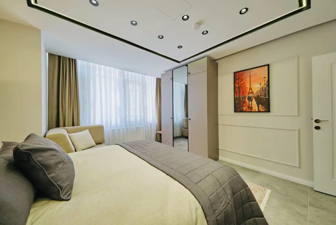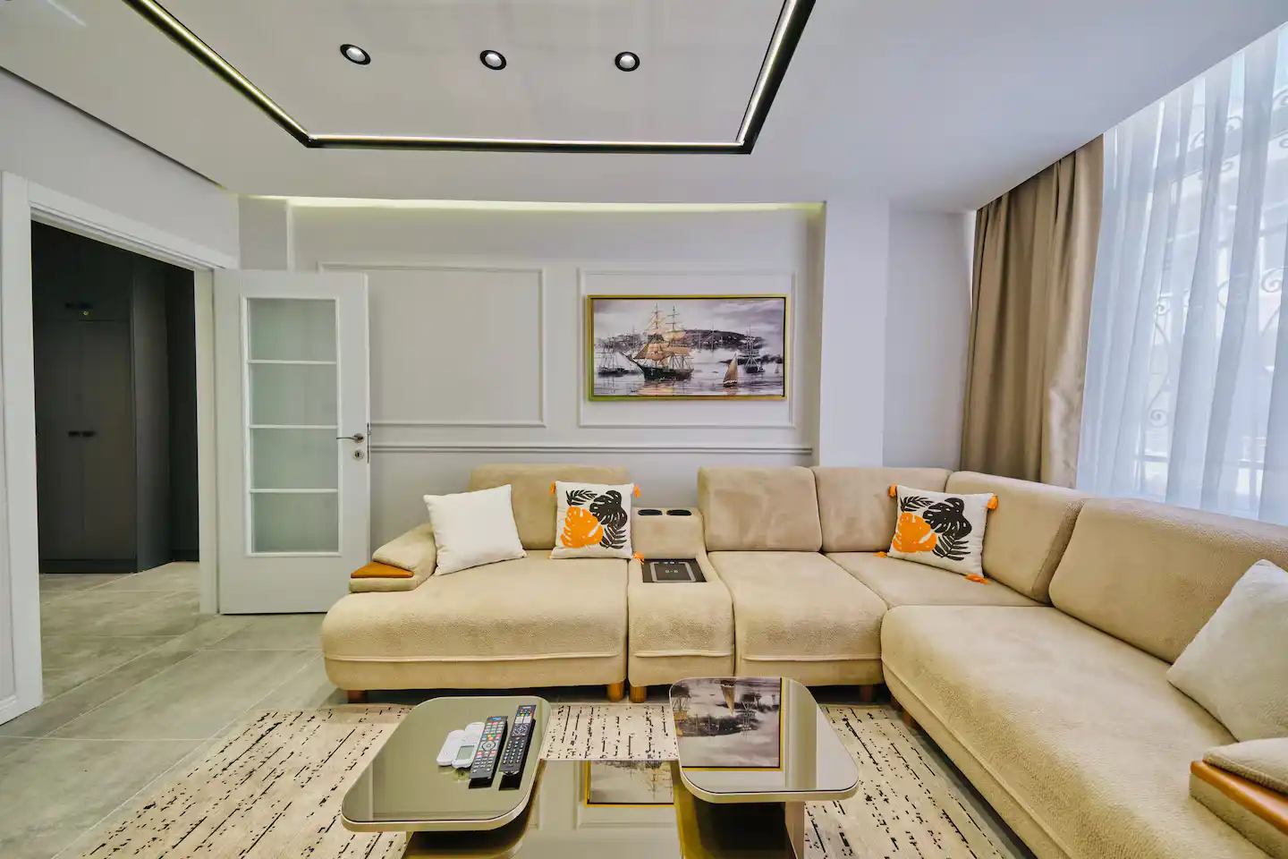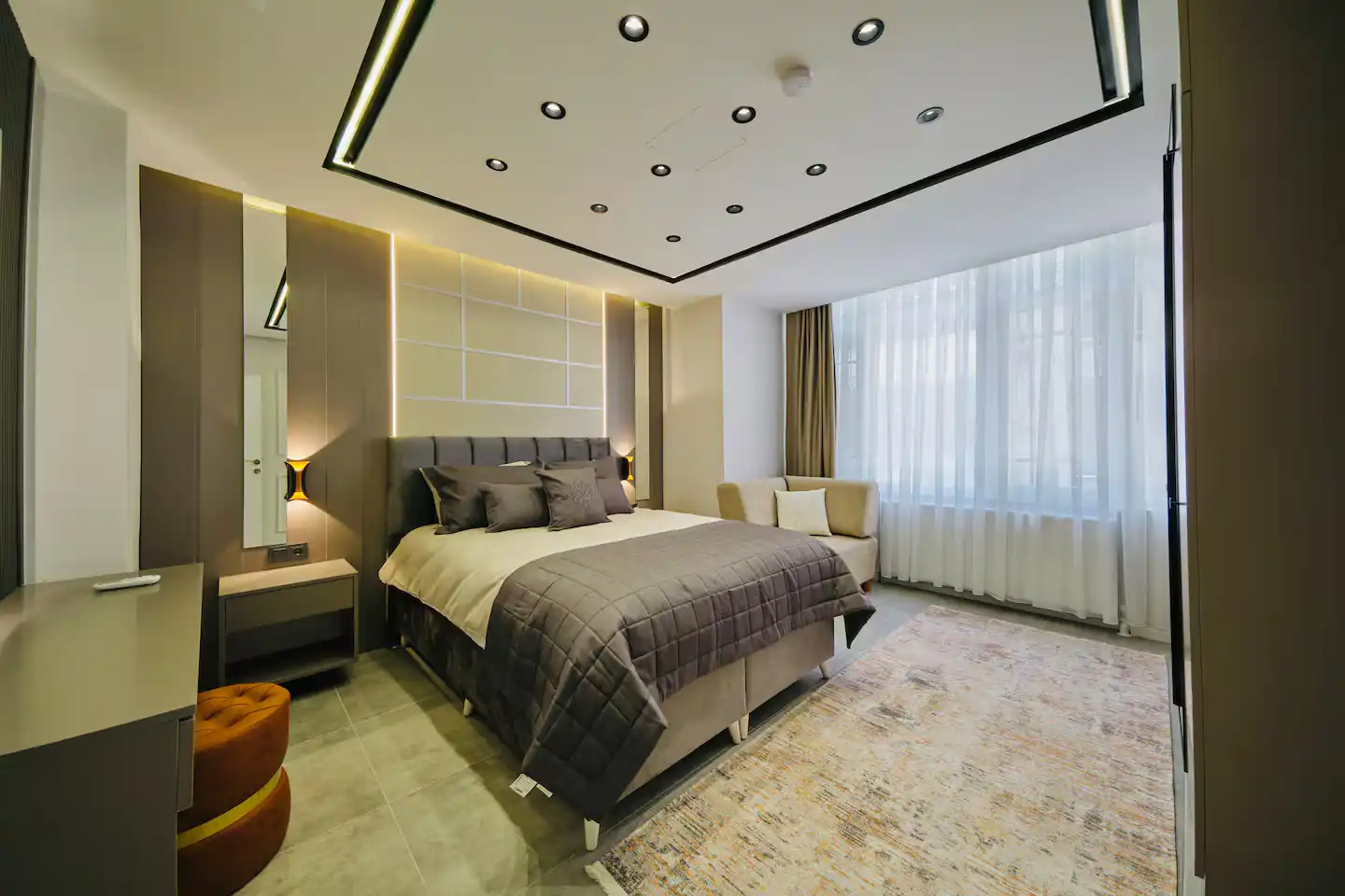 این آپارتمان برای اجاره کوتاه مدت در تکسیم، یک واحد معمولی نیست. این خانه به طور کامل بازسازی شده و با طراحی داخلی مدرن و نورپردازیهای سقف خیرهکننده (همانطور که در تصاویر پیداست)، فضایی مجلل و آرامشبخش را ایجاد کرده است.