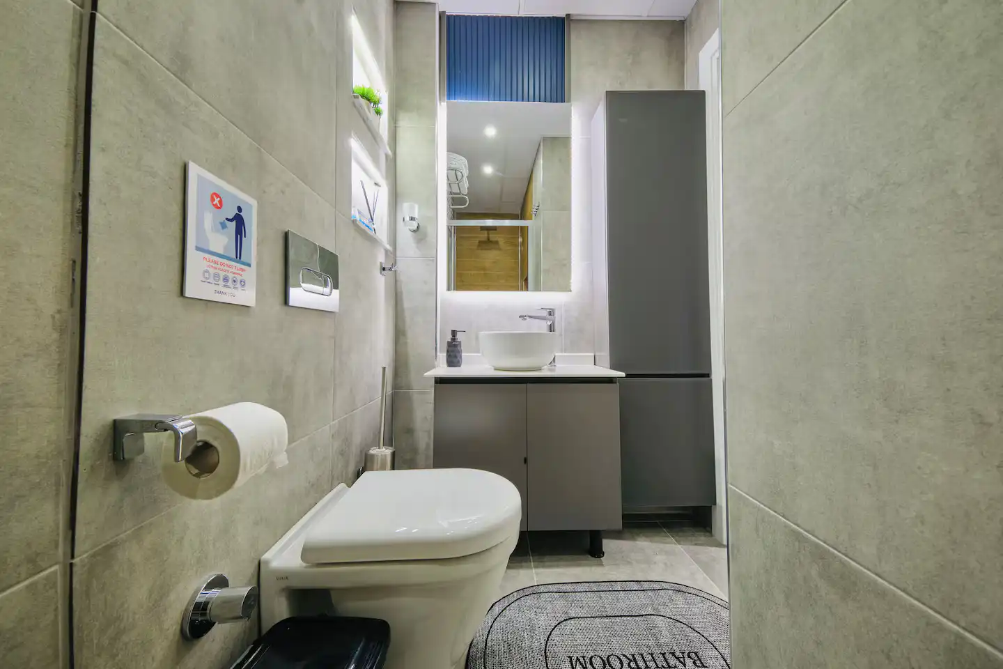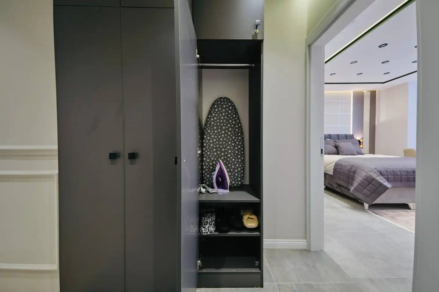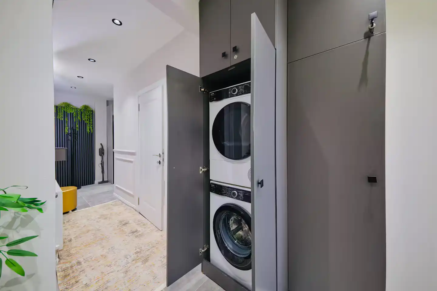 خشککن لباس (Dryer): یکی از بزرگترین و کمیابترین مزیتهای این آپارتمان، وجود دستگاه خشککن لباس در کنار ماشین لباسشویی است. این یعنی شما میتوانید لباسهای خود را بشویید و بلافاصله خشک و آماده پوشیدن تحویل بگیرید؛ یک ویژگی عالی برای مسافران.