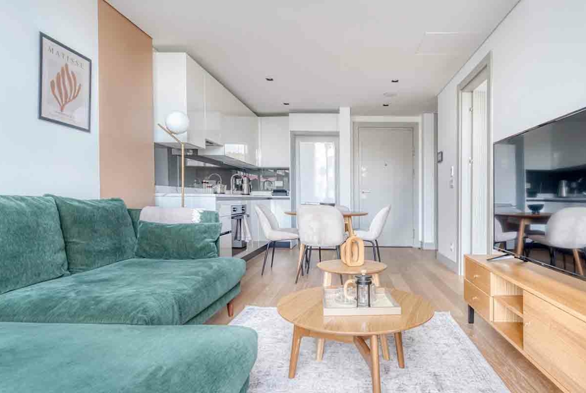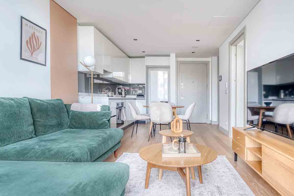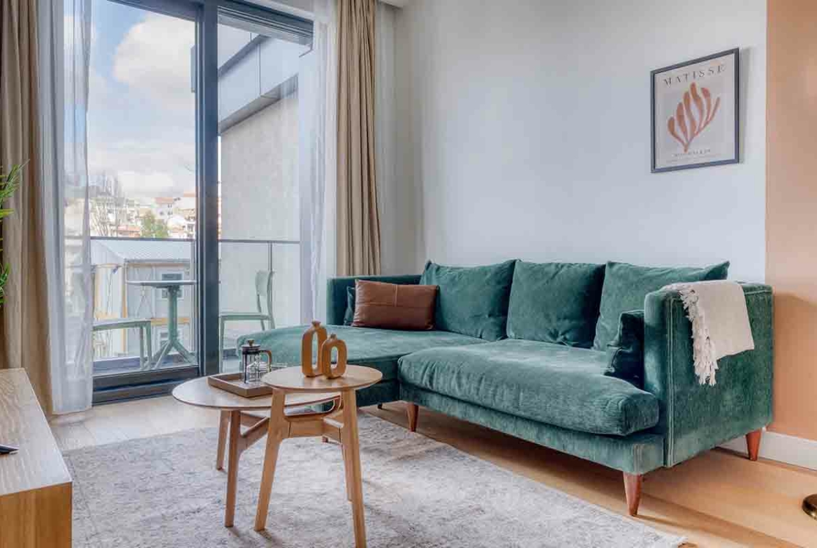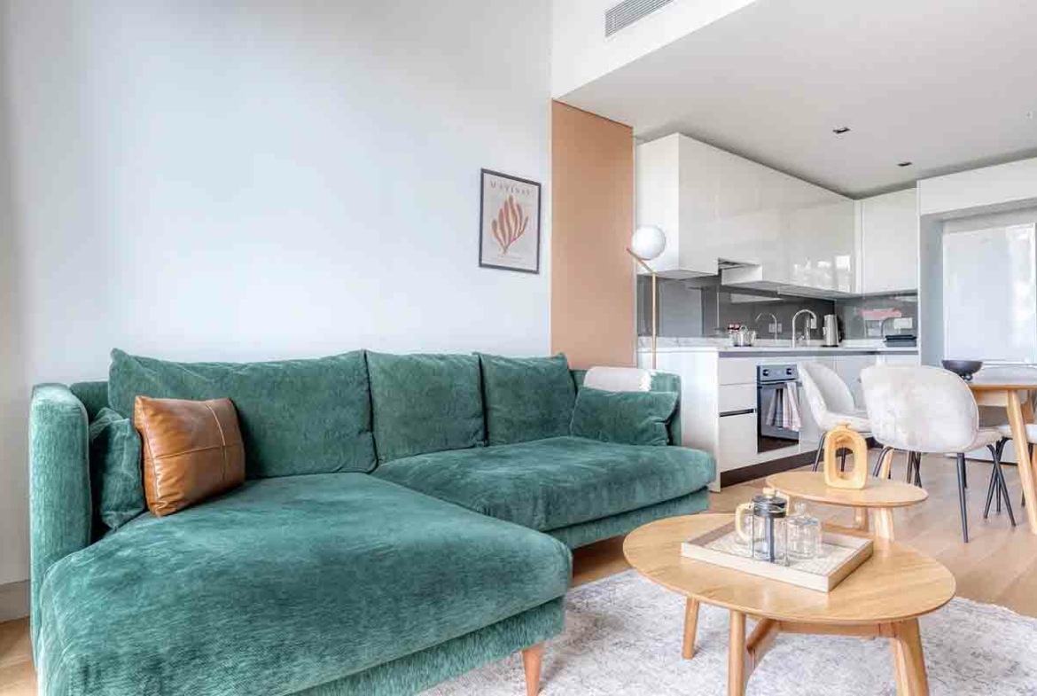 سالن پذیرایی: سالن پذیرایی با مبلمان مدرن و کاملاً نو (همانطور که در تصاویر با کاناپه سبز مخملی شیک مشخص است)، فضایی شیک و در عین حال گرم ایجاد کرده است.