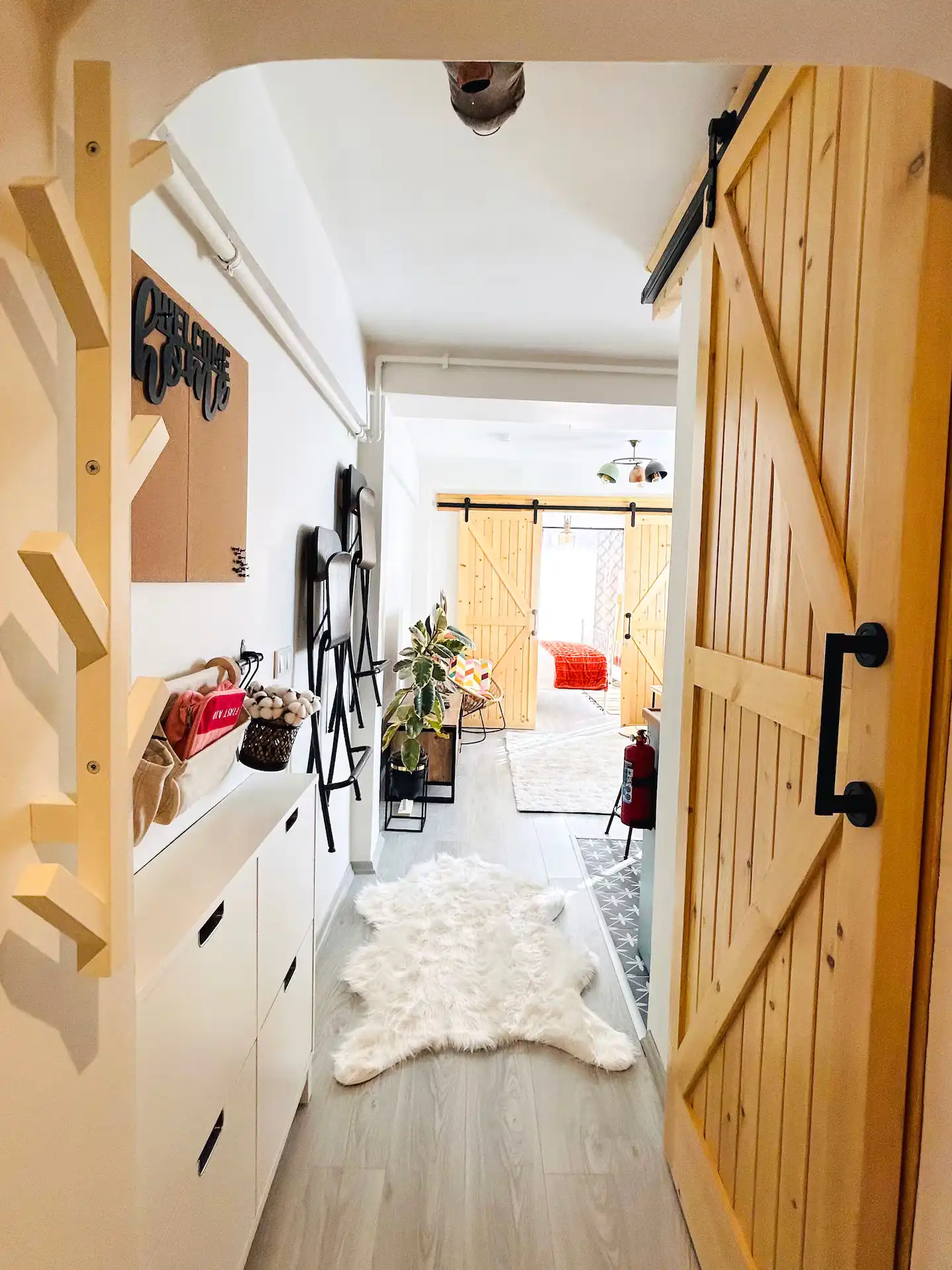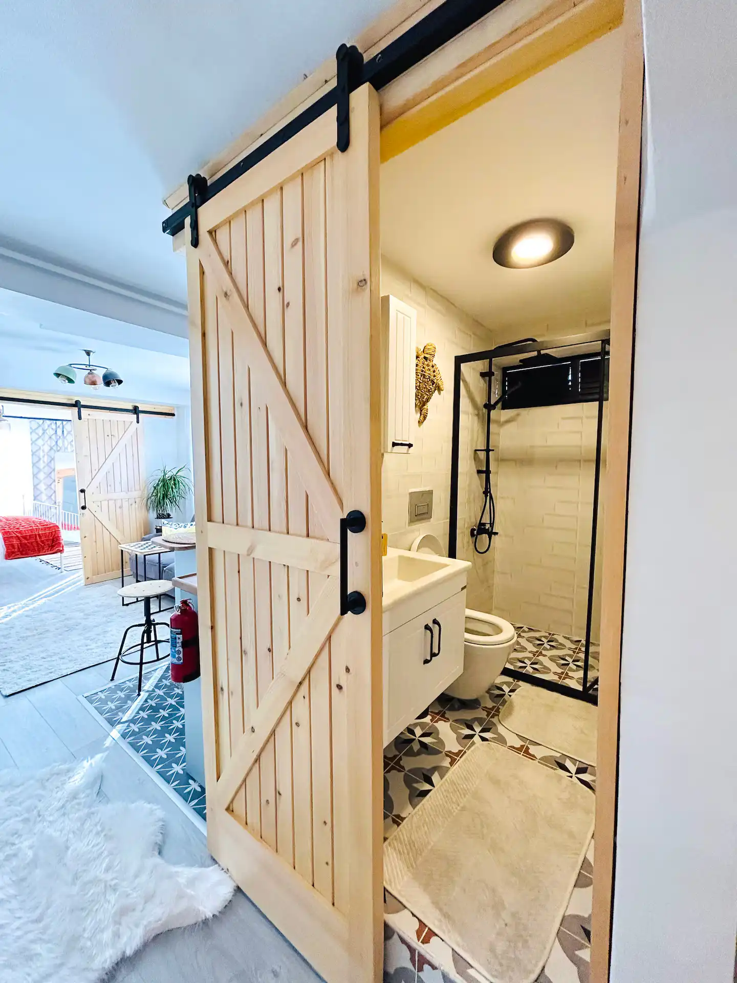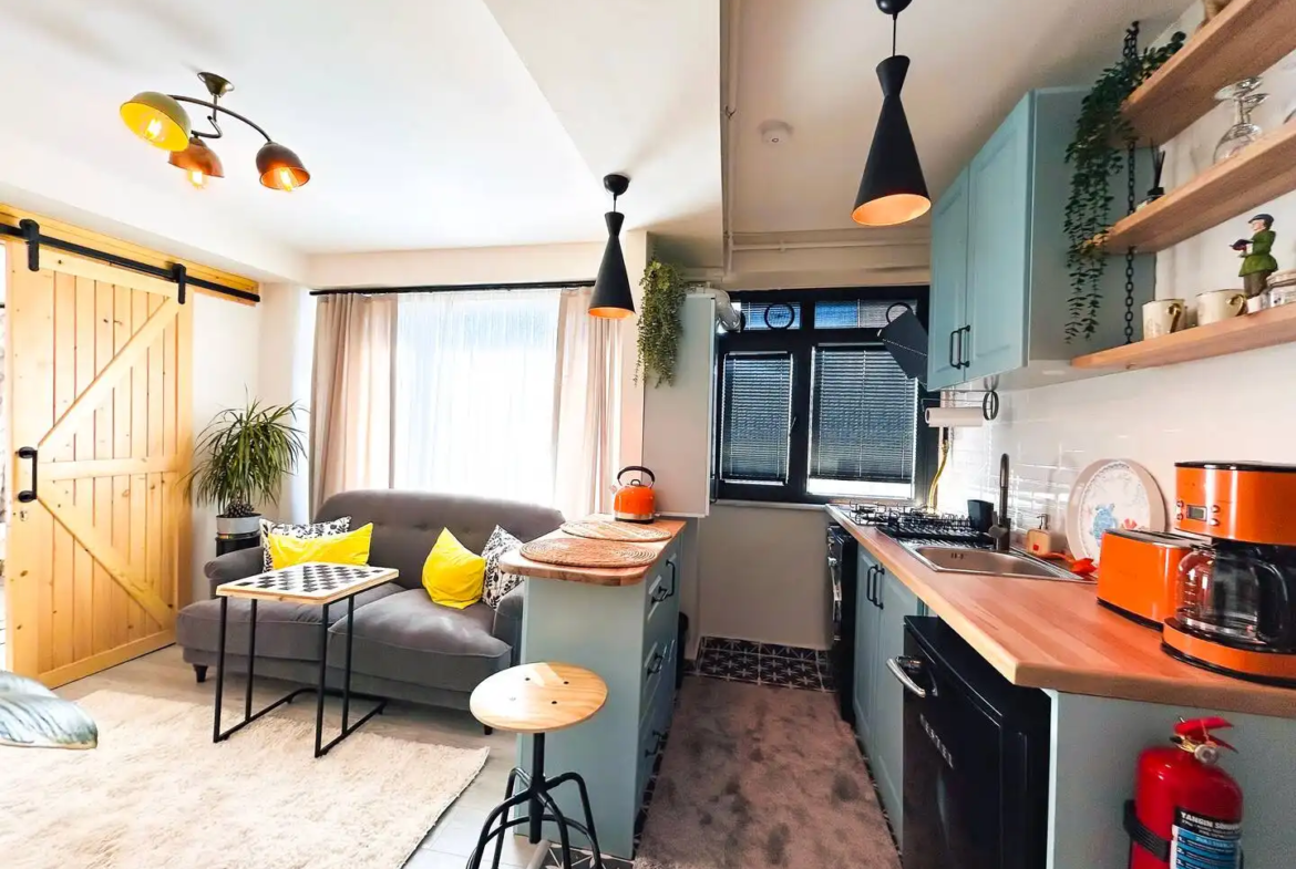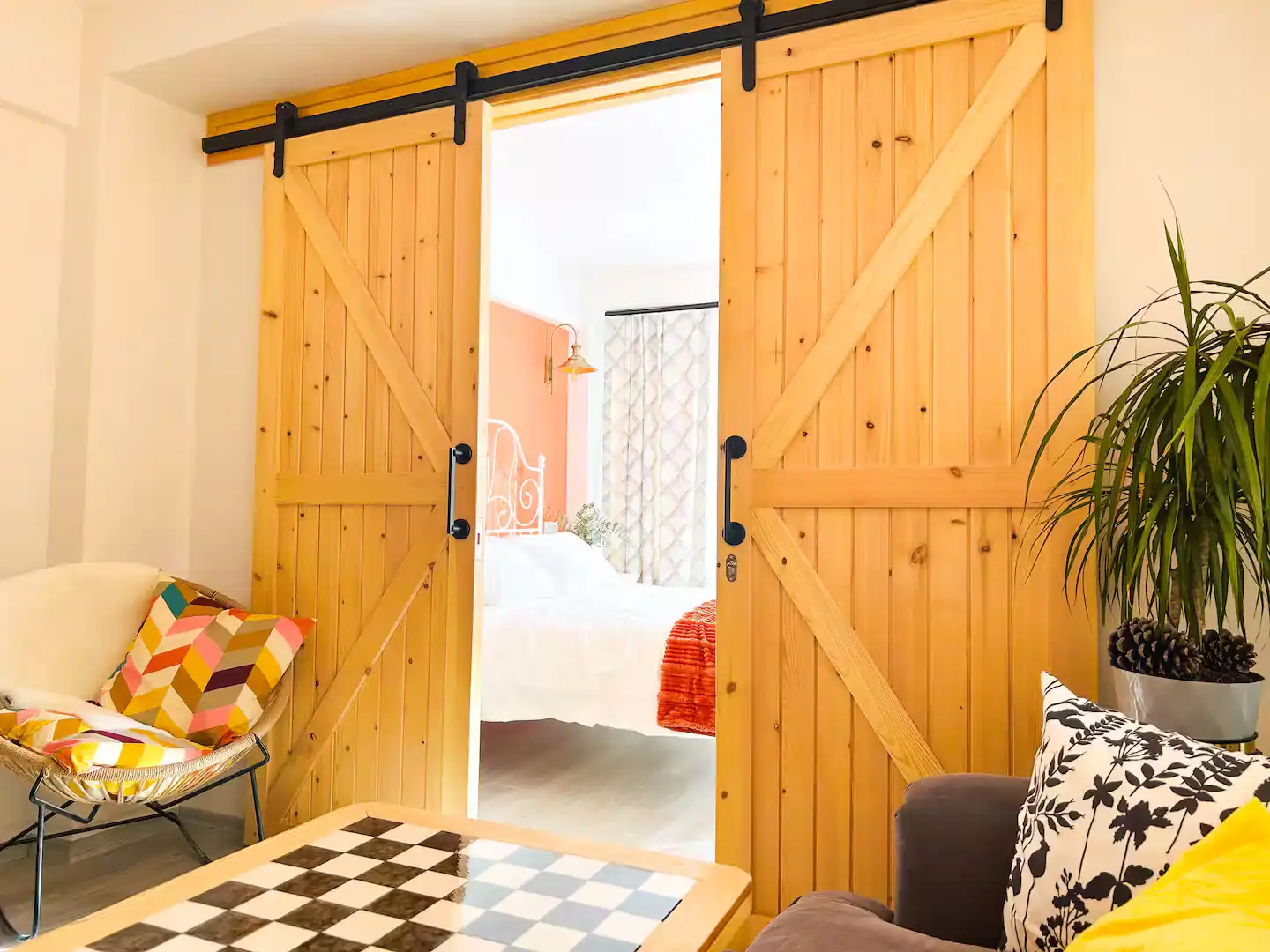 - دکوراسیون چوبی و دنج: ویژگی اصلی این خانه، استفاده زیبا و هوشمندانه از چوب است. درب کشویی چوبی به سبک روستیک که اتاق خواب را از فضای نشیمن جدا میکند، در کنار آشپزخانهای با کابینتهای آبی فیروزهای، فضایی گرم، رنگارنگ و بسیار دلنشین ایجاد کردهاند که حس آرامش و راحتی را به شما منتقل میکند.