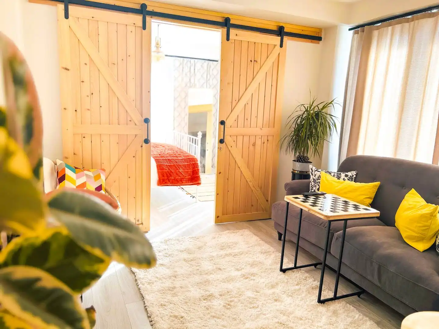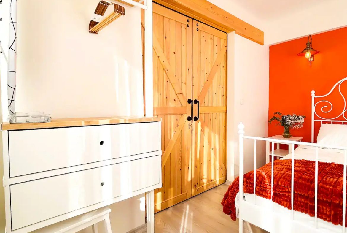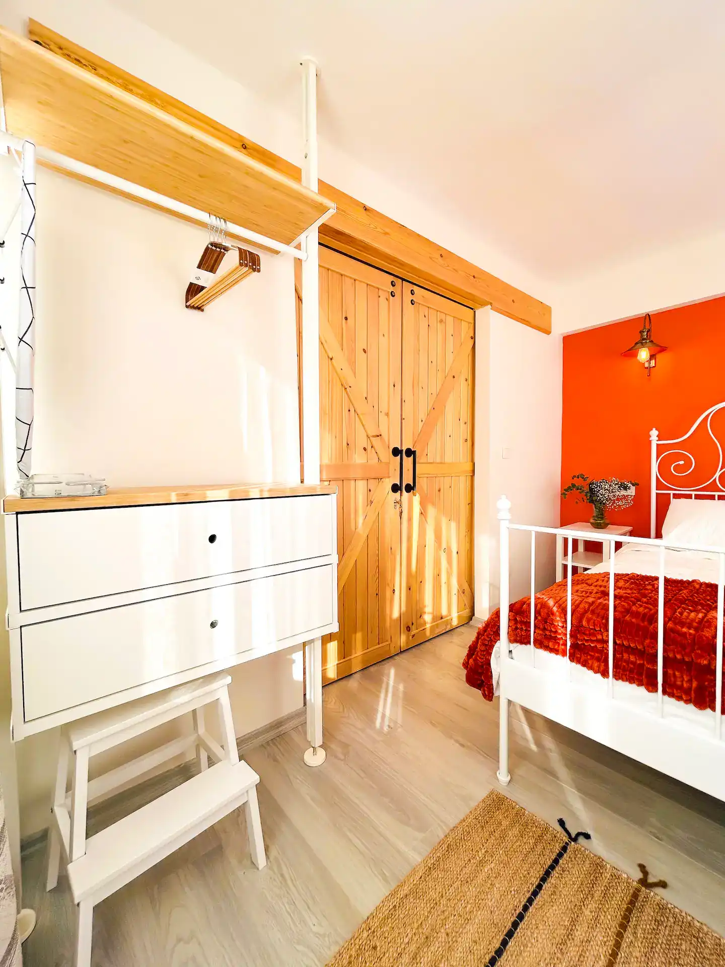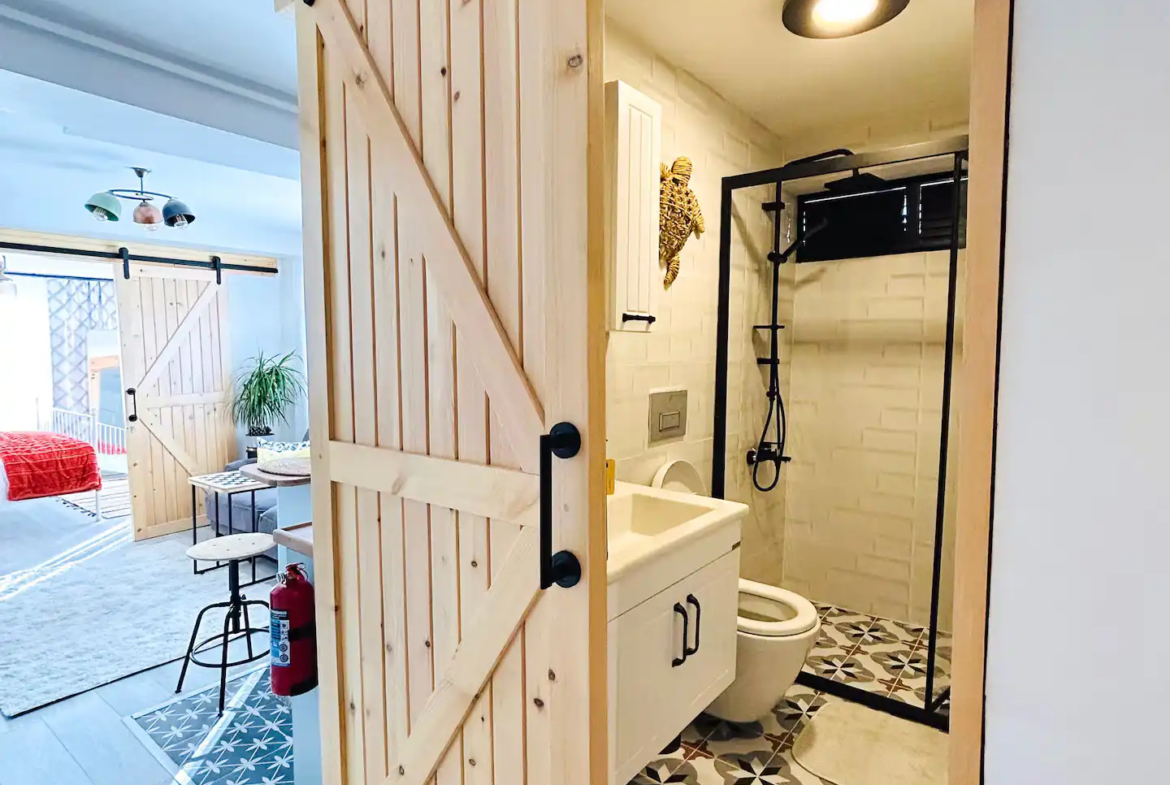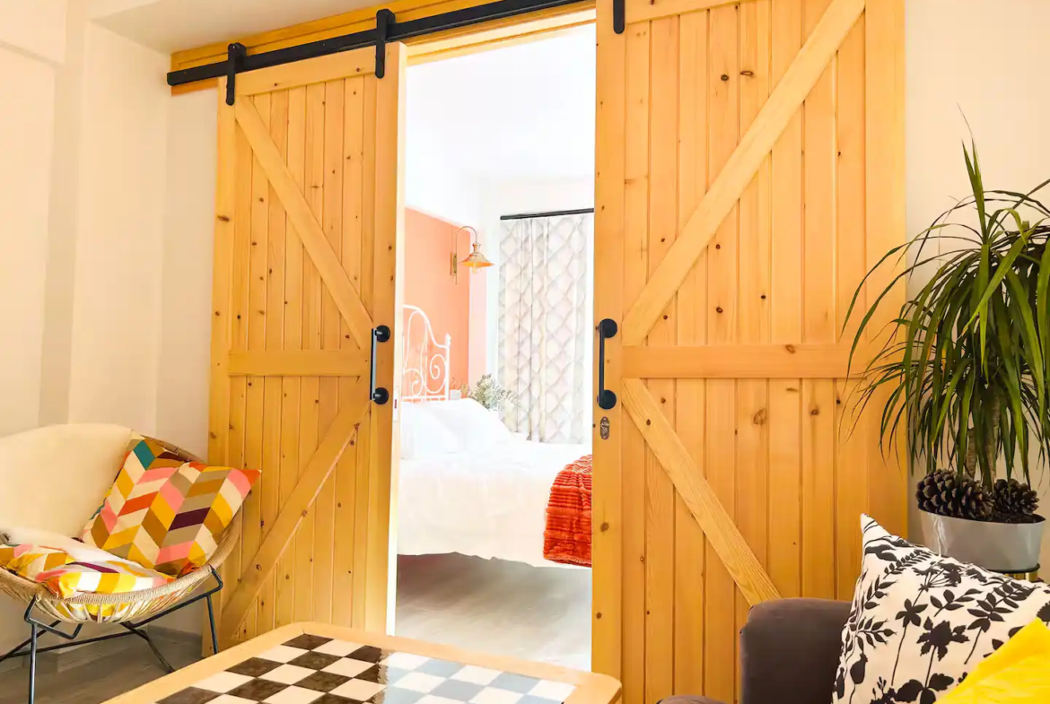- دکوراسیون چوبی و دنج: ویژگی اصلی این خانه، استفاده زیبا و هوشمندانه از چوب است. درب کشویی چوبی به سبک روستیک که اتاق خواب را از فضای نشیمن جدا میکند، در کنار آشپزخانهای با کابینتهای آبی فیروزهای، فضایی گرم، رنگارنگ و بسیار دلنشین ایجاد کردهاند که حس آرامش و راحتی را به شما منتقل میکند.