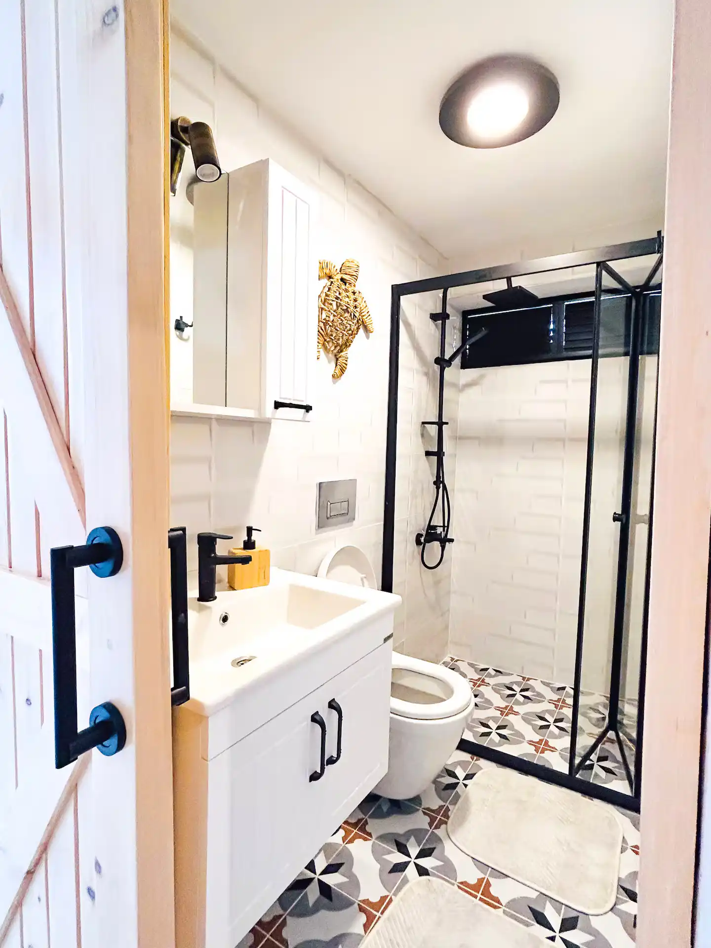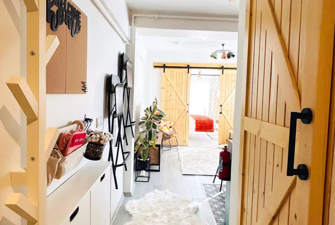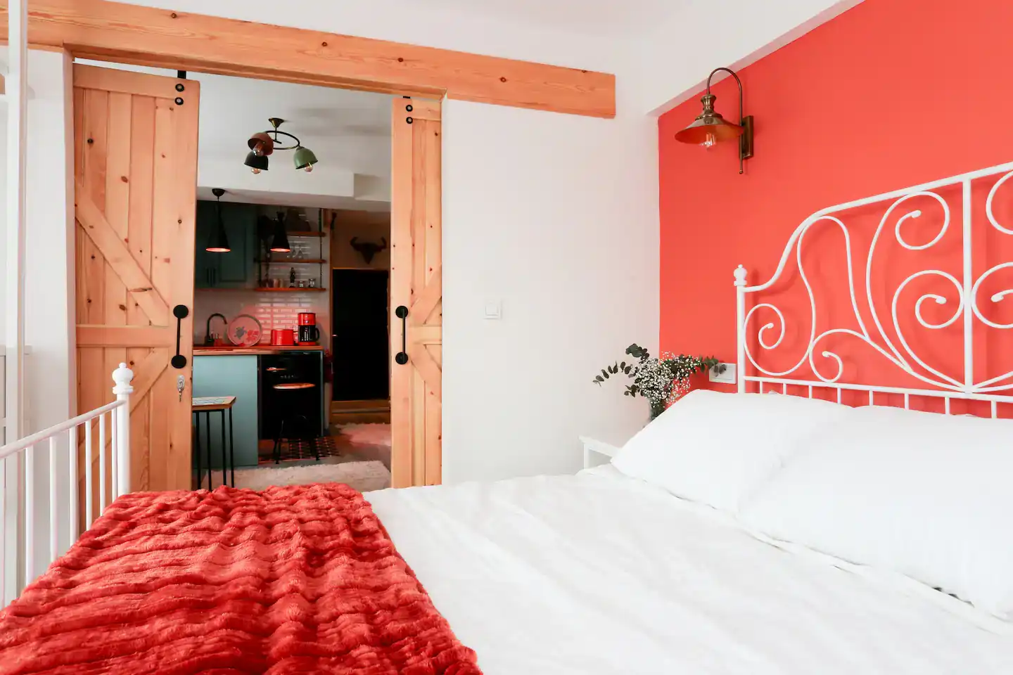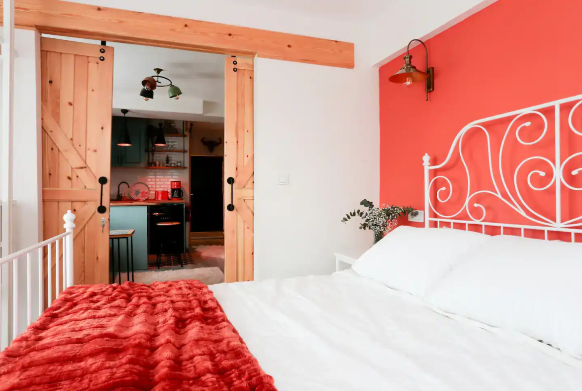 - دکوراسیون چوبی و دنج: ویژگی اصلی این خانه، استفاده زیبا و هوشمندانه از چوب است. درب کشویی چوبی به سبک روستیک که اتاق خواب را از فضای نشیمن جدا میکند، در کنار آشپزخانهای با کابینتهای آبی فیروزهای، فضایی گرم، رنگارنگ و بسیار دلنشین ایجاد کردهاند که حس آرامش و راحتی را به شما منتقل میکند.