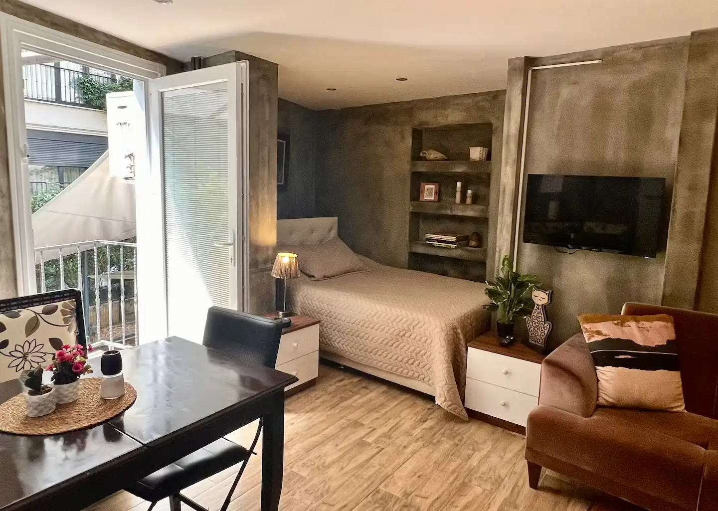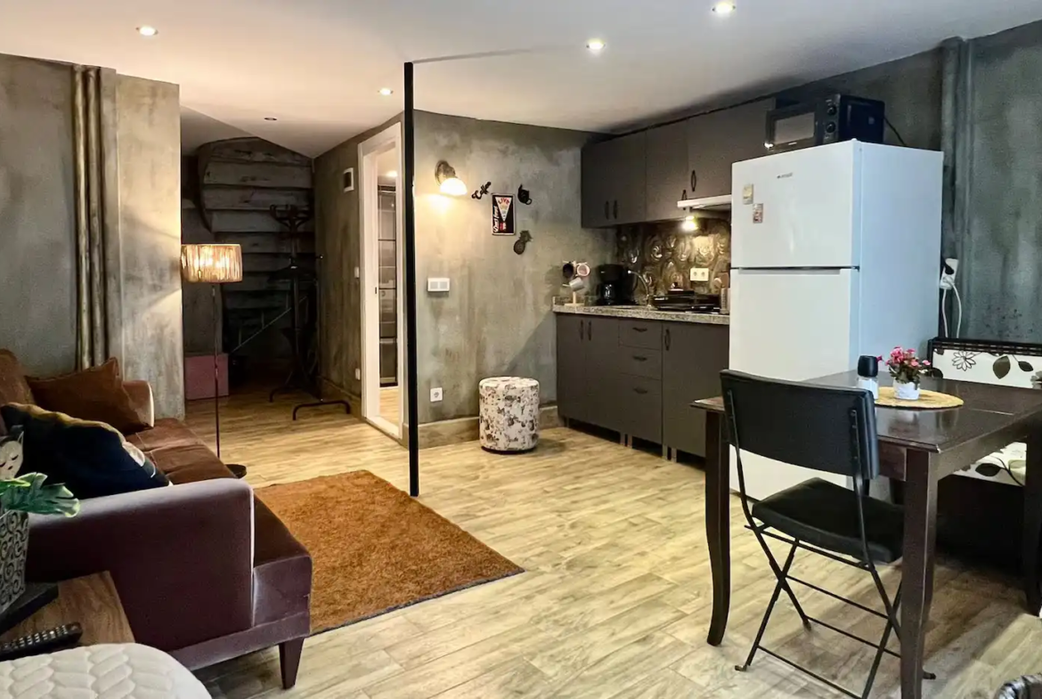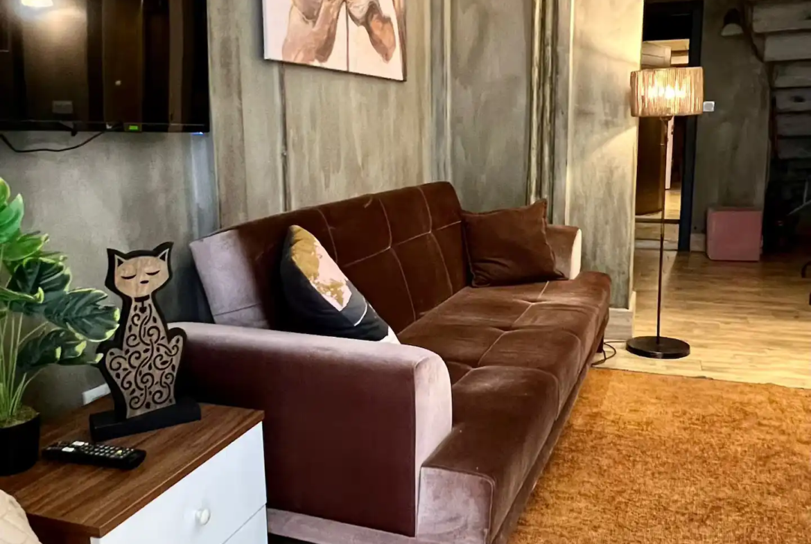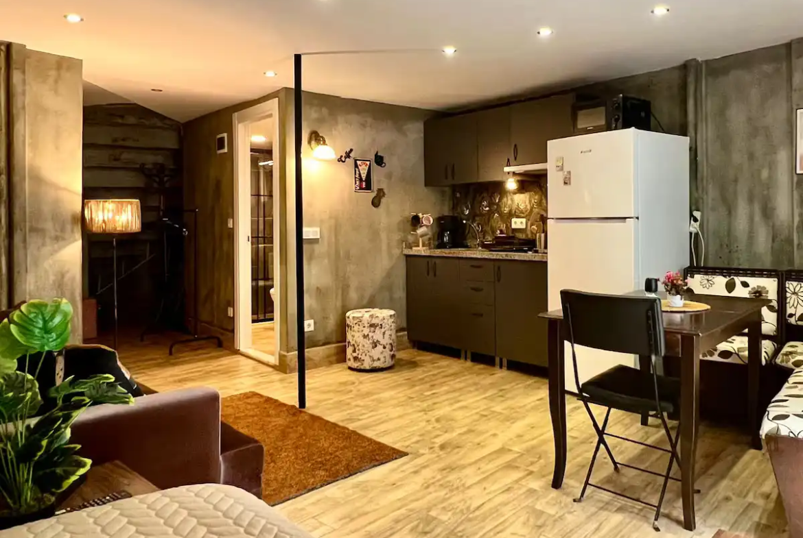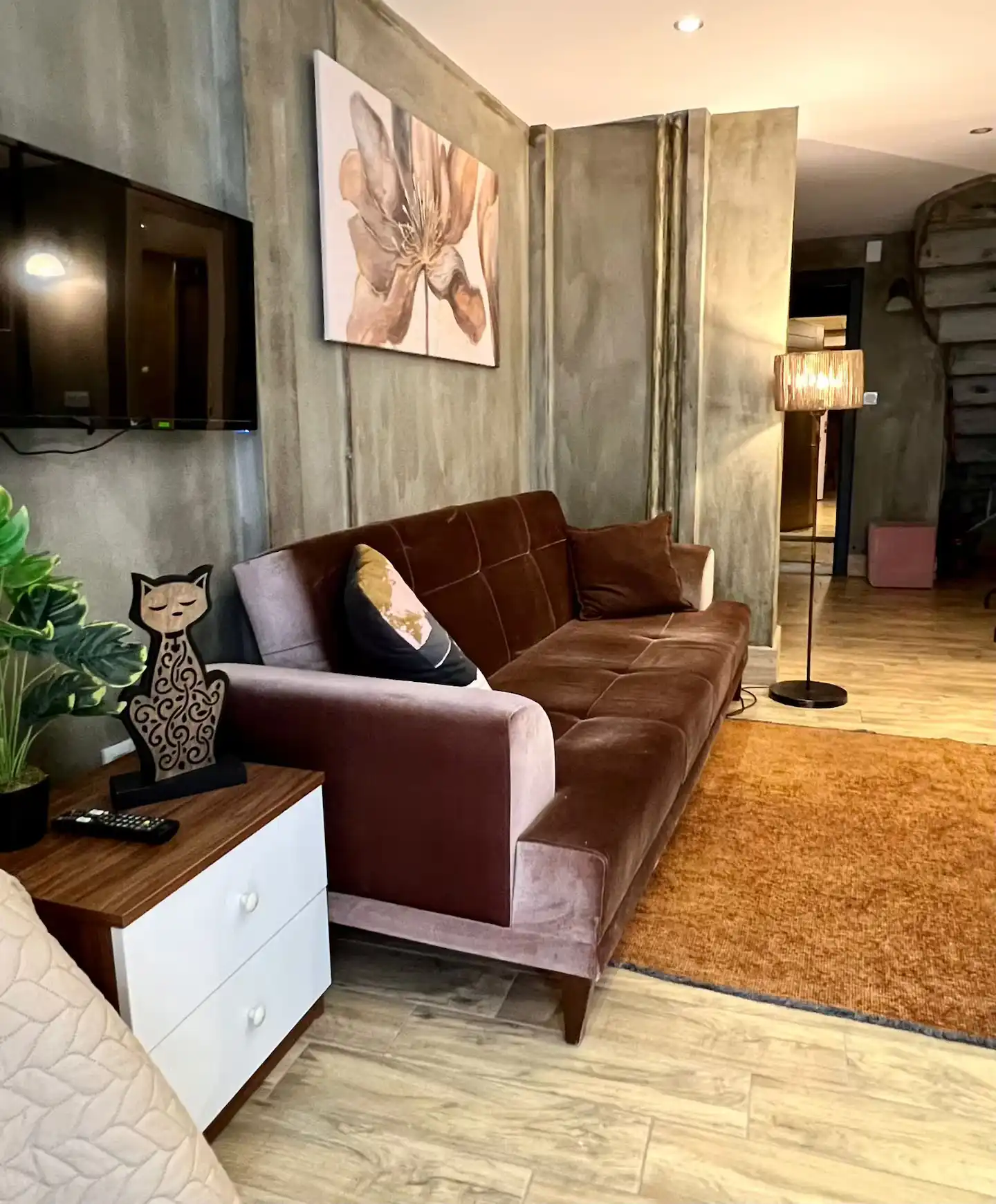 - فضای داخلی هنری: این سوئیت با دیوارهای طرح بتن، جداکنندههای فلزی تیره، کفپوش چوبی و مبلمان مدرن، فضایی به سبک آپارتمانهای لوفت نیویورکی را تداعی میکند. این طراحی خاص، اقامت شما را به تجربهای متفاوت و به یاد ماندنی تبدیل میکند.