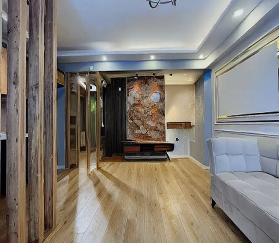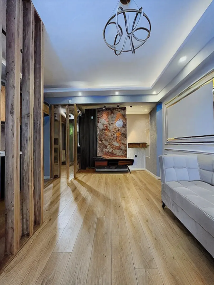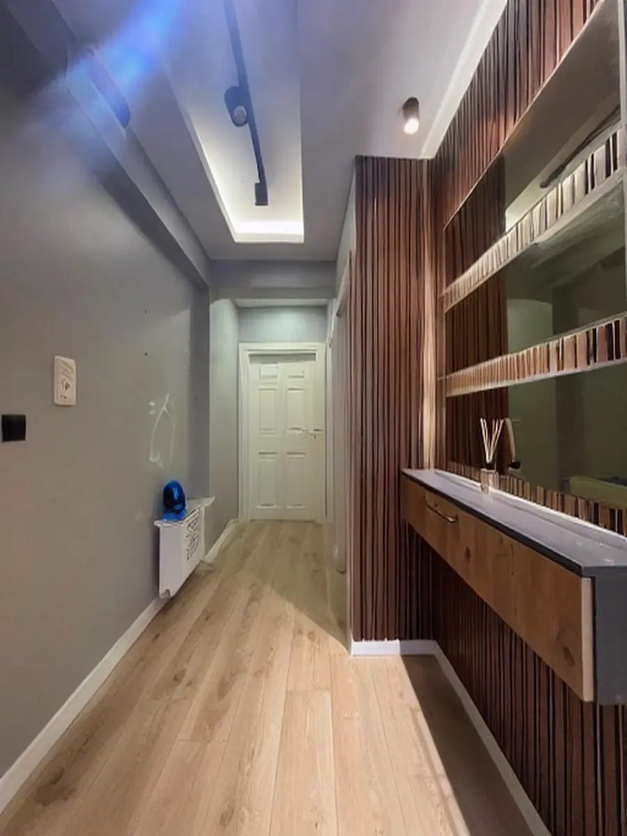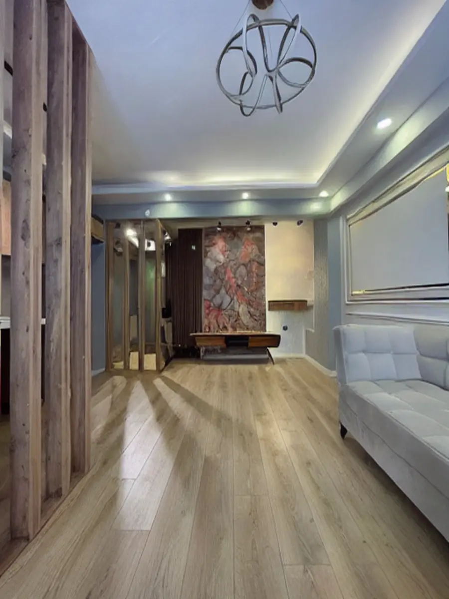 طراحی داخلی: واحد دارای نورپردازی مخفی، کفپوش لمینت با کیفیت و دکوراسیون دیواری مدرن در سالن است.