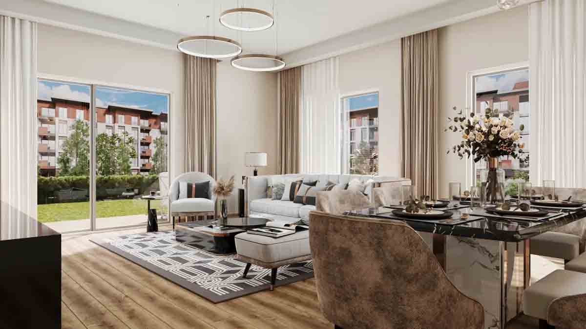 وارد اتاقهای نشیمن دلپذیر شوید که با دکوراسیون گرم، کفپوش لمینت و پنجرههای دوجداره بزرگ که مناظر خیرهکنندهای را ارائه میدهند، آراسته شدهاند. هر آپارتمان همچنین دارای دسترسی به بالکن خصوصی است که تجربه زندگی شما را در این اقامتگاههای استثنایی باشاک شهیر ارتقا میبخشد.