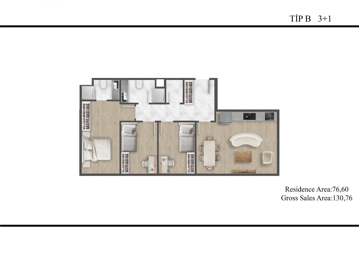 آپارتمانهای ۳ خوابه: متراژ ۱۳۰ تا ۱۴۲ متر مربع، قیمت از ۴۵۳,۵۱۵ دلار تا ۶۵۱,۹۲۷ دلار.