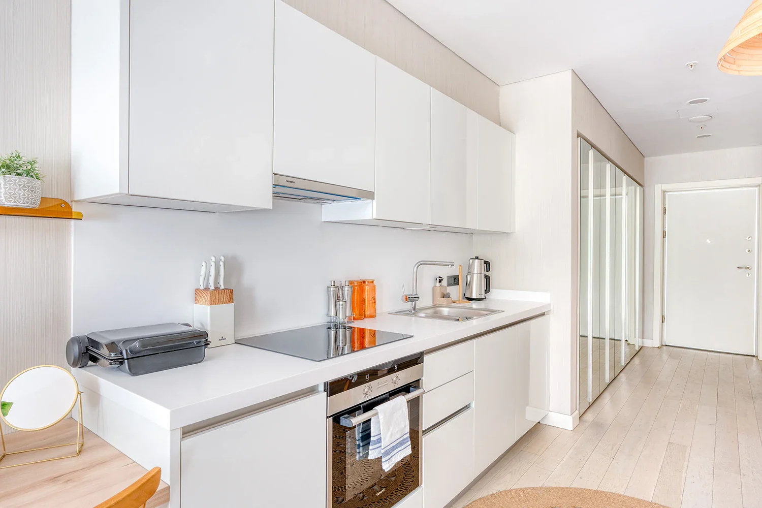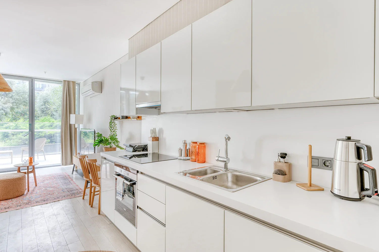 آشپزخانه با طراحی توکار (Built-in)، شامل تمام لوازم ضروری از جمله یخچال، ماشین ظرفشویی، فر و اجاق گاز رومیزی است. فضای اصلی خانه با پنجرههای بزرگ و دو جداره، نور طبیعی فوقالعادهای را به داخل دعوت کرده و آرامش و سکوت را تضمین مینماید.